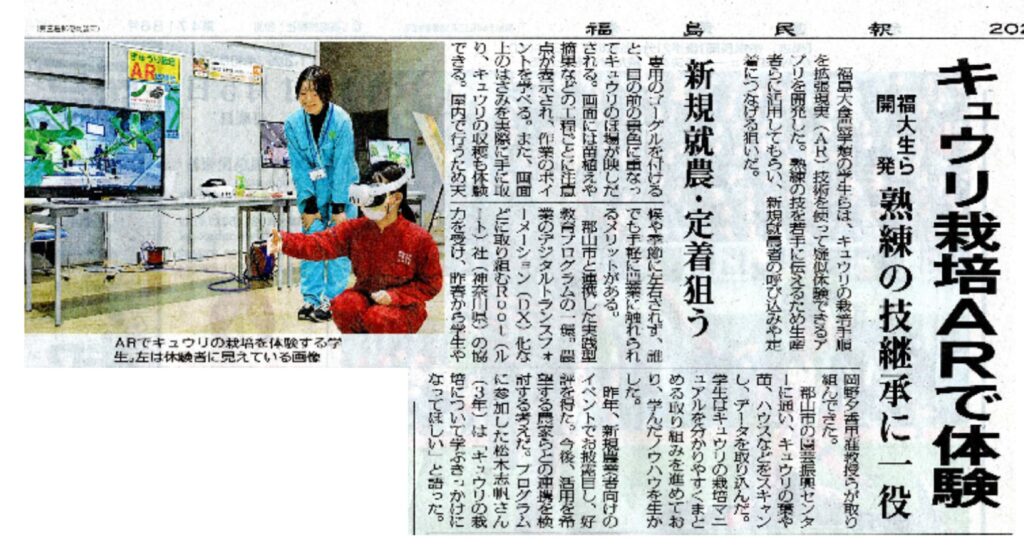 昨年11/24にビックパレットふくしまで開催されたふくしま農業人フェアにて,作成したキュウリ栽培のARアプリの体験ブースを出展し,子供からご年配の方まで多くの方々に体験していただき,好評でした。