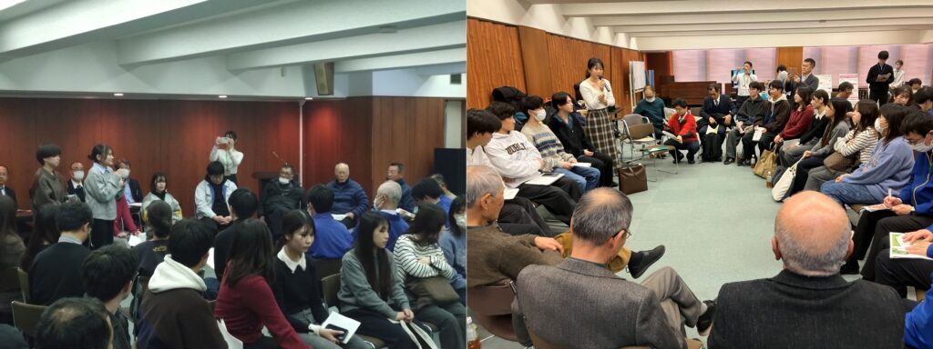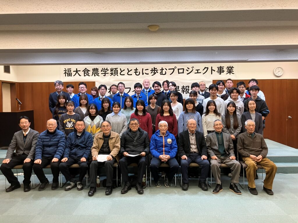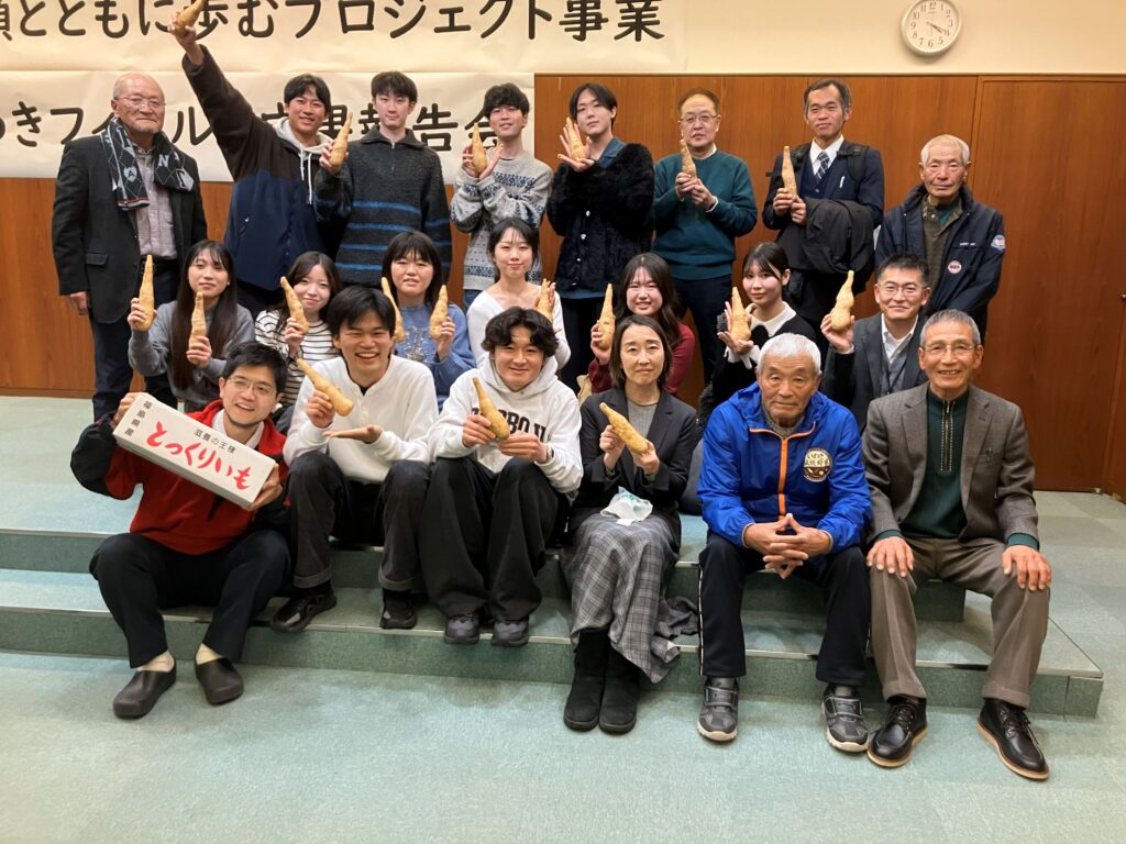 この日は、イチジクととっくり芋の生産者が各8人、JA福島さくらの担当者が各1人、マルト商事からは6人が学生たちの報告を聴きに来てくれました。班ごとの報告の後は、イチジクととっくり芋の2グループに分かれて意見交換会を行い、活動に伴走してくれた関係者の皆さんから今年度の活動成果や今後の方向性について有益なコメントをいただきました。閉会の挨拶の後も、学生たちとの会話は続き、来年度に向けて多くのことを託されました。