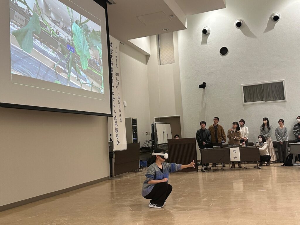 最初の発表はVR班で,AR体験アプリを使ったきゅうり栽培の様子を披露し,参加者の関心が多く集まりました。