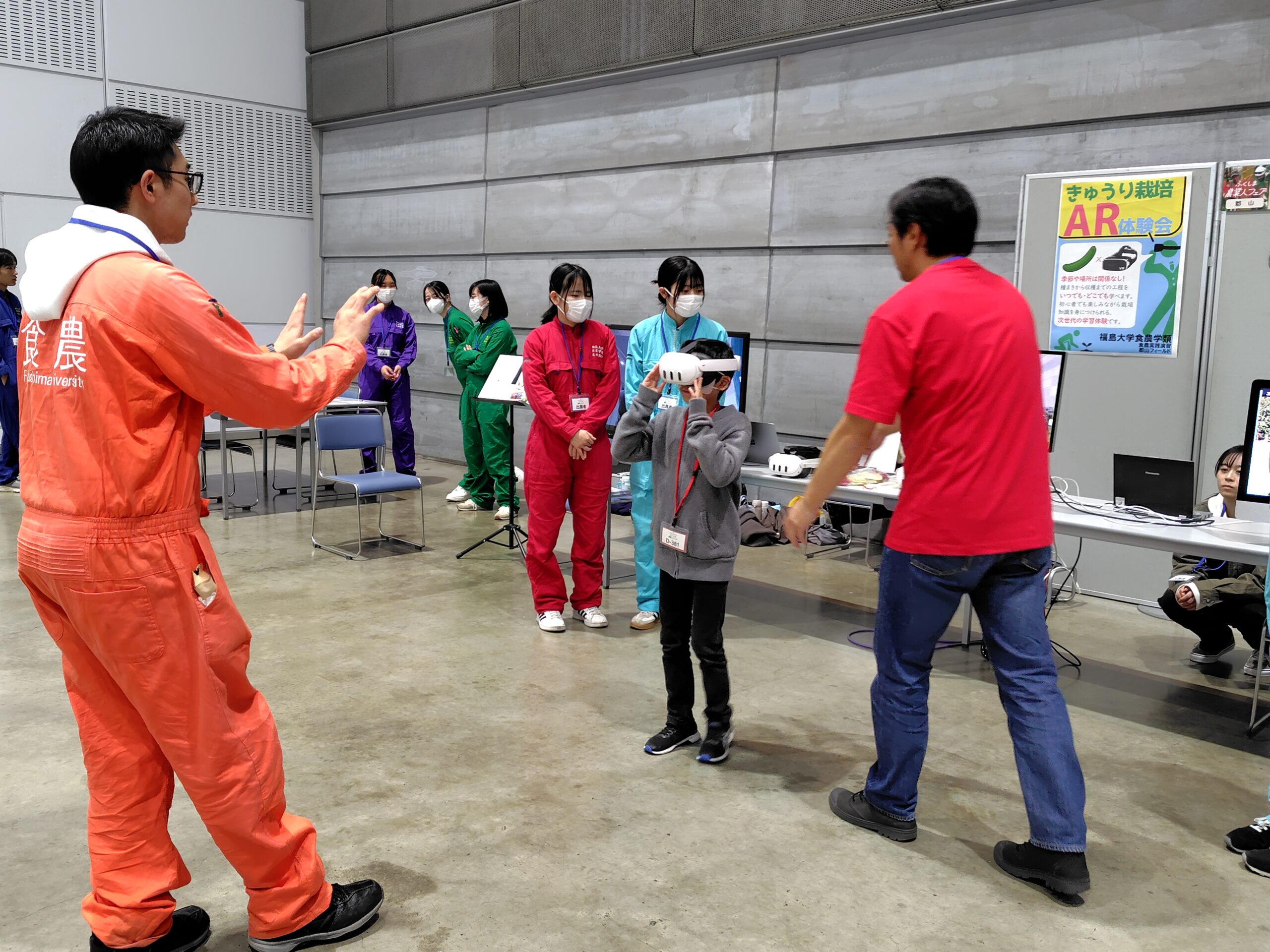 昨年11/24にビックパレットふくしまで開催されたふくしま農業人フェアにて,作成したキュウリ栽培のARアプリの体験ブースを出展し,子供からご年配の方まで多くの方々に体験していただき,好評でした。