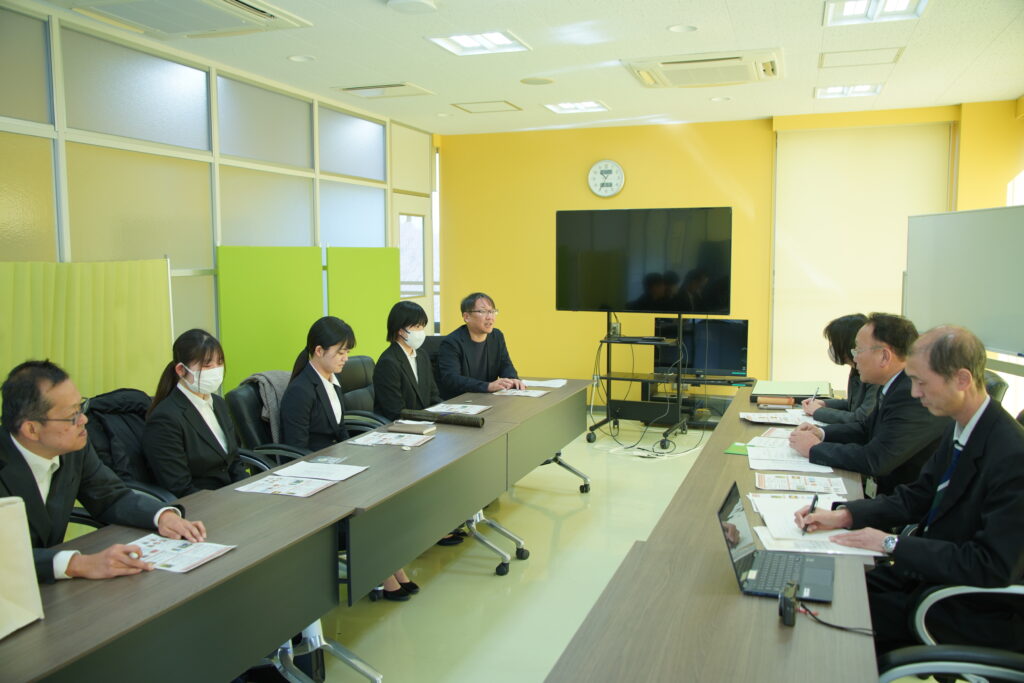 3月6日(金)に東北農政局福島県拠点 副参事官 宮澤一博様らが来校され、代表の阿部ひなたさん(4年生)、佐藤瑞稀さん(3年)、直井七海さん(3年)に対して賞状及び副賞(缶バッジ)が授与され、その後、この研究に取り組んだ背景や狙い、苦労した点、今後の研究の発展方向などに関して意見交換を行いました。
