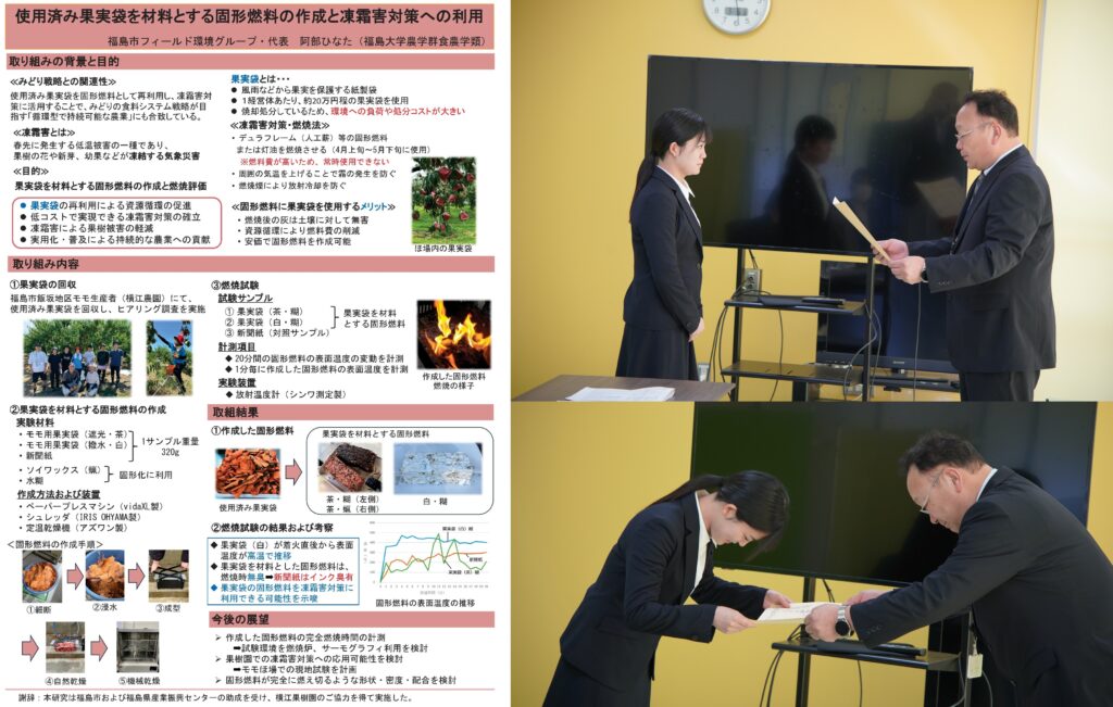 農学実践型教育プログラム福島市フィールド環境グループでは、「使用済み果実袋を材料とする固形燃料の作成と凍霜害対策への利用」という取り組みについて、研究成果を取りまとめて応募し、見事に、東北農政局みどり戦略推進官賞を受賞しました。