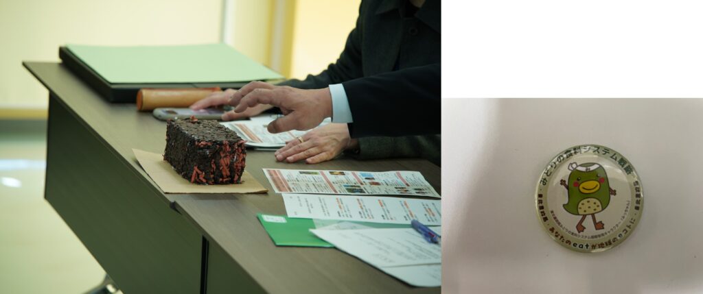 果実袋を原料とした固形燃料を実際に見ていただきました        副賞の缶バッジ
